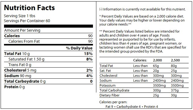 It’s odd too me that the primary ingredient is olive oil and yet it has no calories or fat. Since when does oil come fat-free? For reference, let’s jump down below to a bottle of pure liquid 100% Extra Virgin Olive Oil. For those not up on your metrics, a ml equals roughly a tablespoon and this product has a whopping 120 calories and 14 grams of fat per serving. This is actually quite standard for oil.
