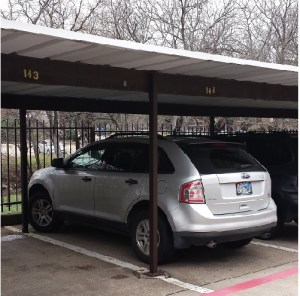 My Ford Edge was just across from my apartment under the covered parking area which is my standard as opposed to using the open parking area. For every two parking spaces, there is a support column that runs from under the roof down into the ground packed in by concrete. One way or the other, you will have one of these support columns on your back left or right as you pull out.
