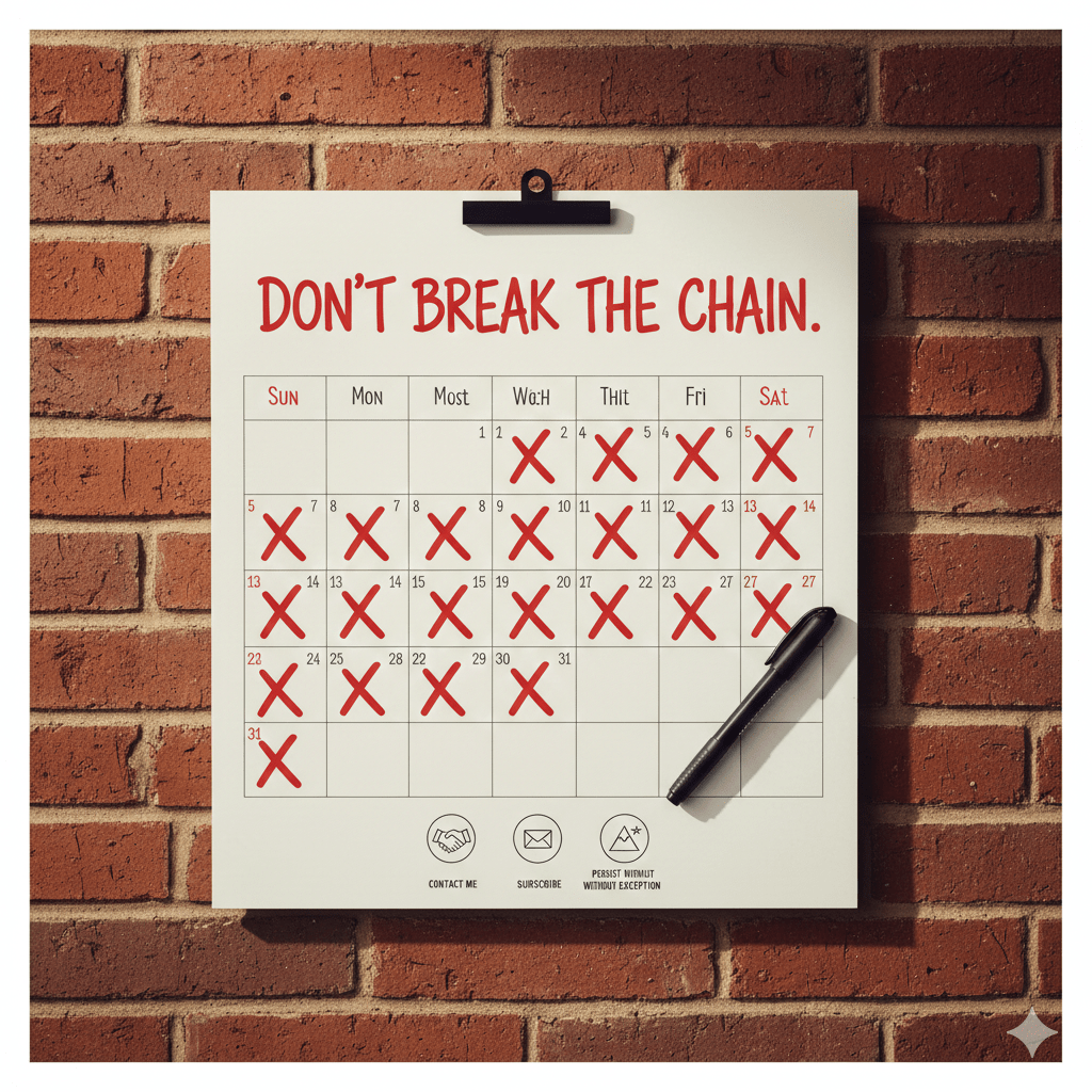 I read an article about Jerry Seinfeld where he shared a secret to his success: his wall calendar. When he started out, his goal was just to write every day. Some days were “gold,” and some were “garbage,” but he wrote regardless. He used a big wall calendar and put a red ‘X’ over every day he wrote. The physical act of marking that calendar created a chain he didn’t want to break. Today, we call this “gamification,” a powerful tool for driving results.