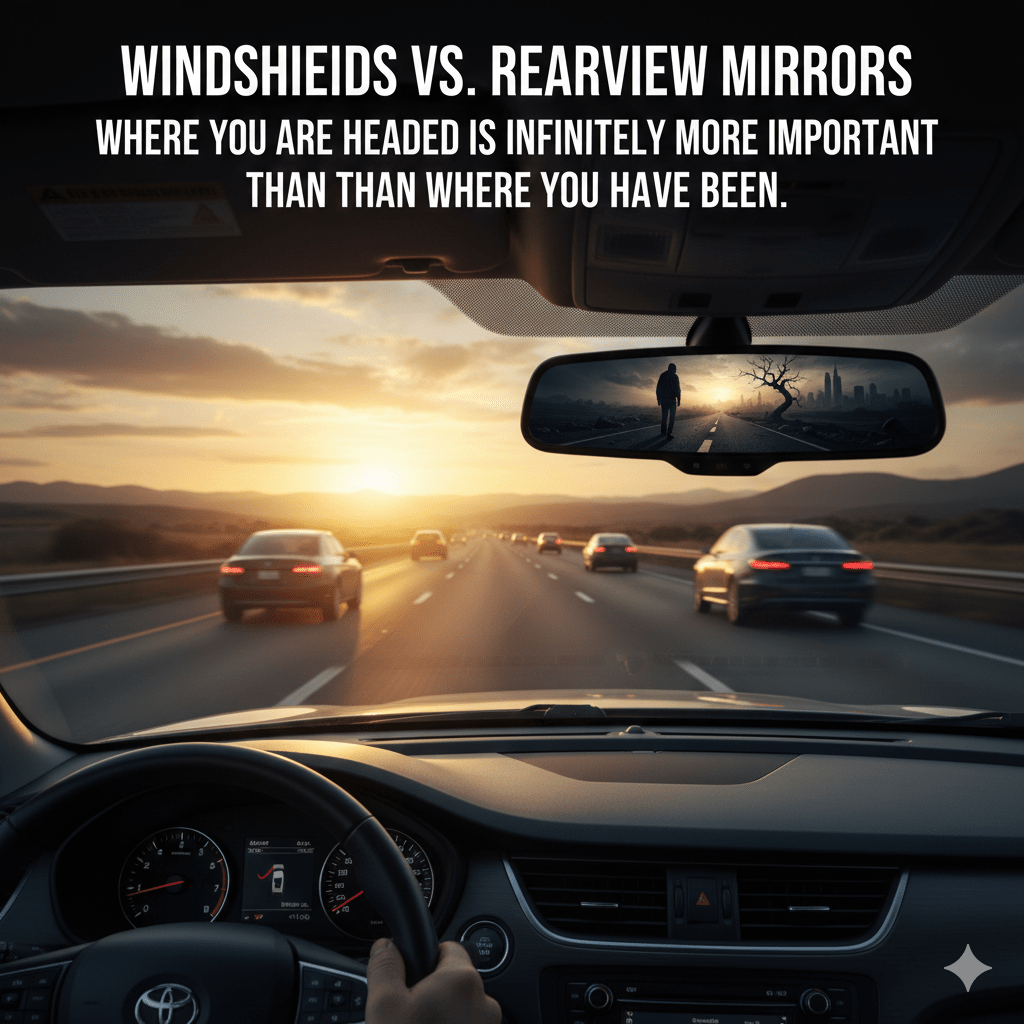 Have you ever noticed the design of your car? The windshield is massive, giving you a wide-angle view of everything ahead. The rearview mirror, by comparison, is tiny. There is a profound life lesson in that engineering: Where you are headed is infinitely more important than where you have been
