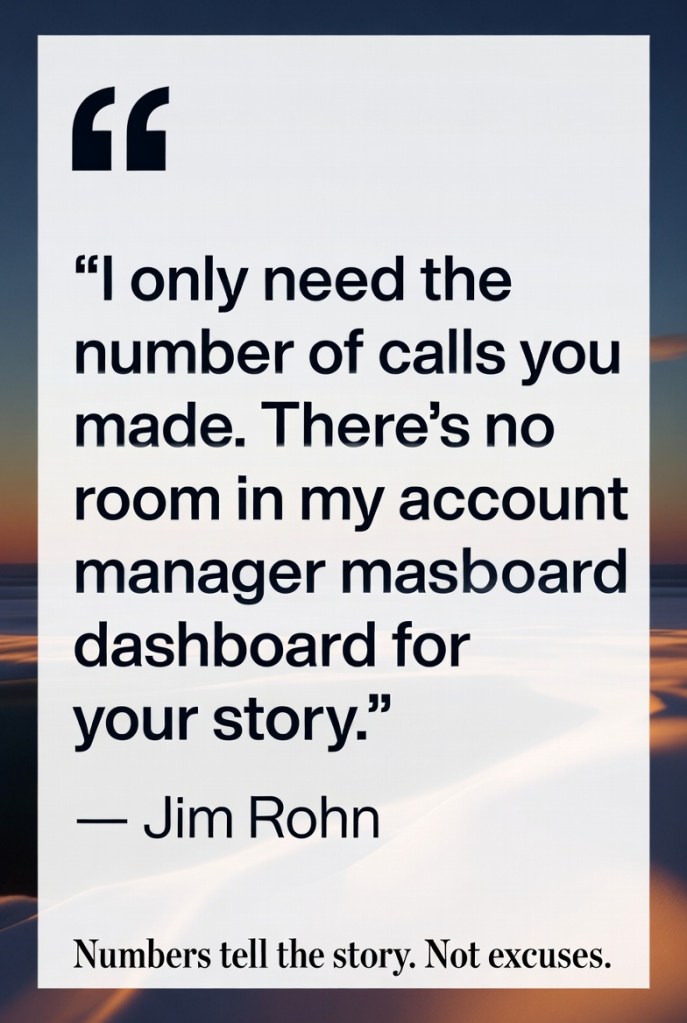 The story was about a sales manager meeting with one of his account managers, who had been tasked with making a certain number of sales calls the week prior. When the sales manager asked, “So how did it go last week?” the account manager immediately launched into an elaborate account of his performance. The manager quickly stopped him and said, “Hold on and wait just a minute, I only need the number of calls you made. There’s no room in my account manager dashboard for your story. If you simply give me the number of calls, I will know the story without any further explanation from you.”