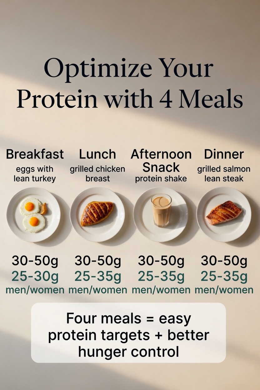 Now, regardless of your daily protein target, are you hitting it? It’s a yes or no. There’s no in between. I believe that to optimize protein intake—even for my smallest female clients, who weigh as little as 110 pounds—you should eat four meals per day: breakfast, lunch, an afternoon snack, and dinner. This manages hunger and makes hitting your protein numbers far more practical. For most people, 25–35 grams per meal for women and 30–50 grams per meal for men is the sweet spot.