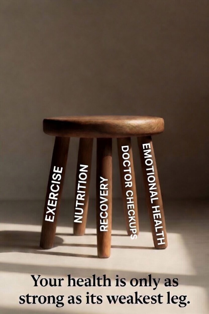 My initial framework was a four-legged model. Then, a couple of years ago, thanks to Peter Attia, MD, in his book Outlive, I added a fifth leg on emotional health.