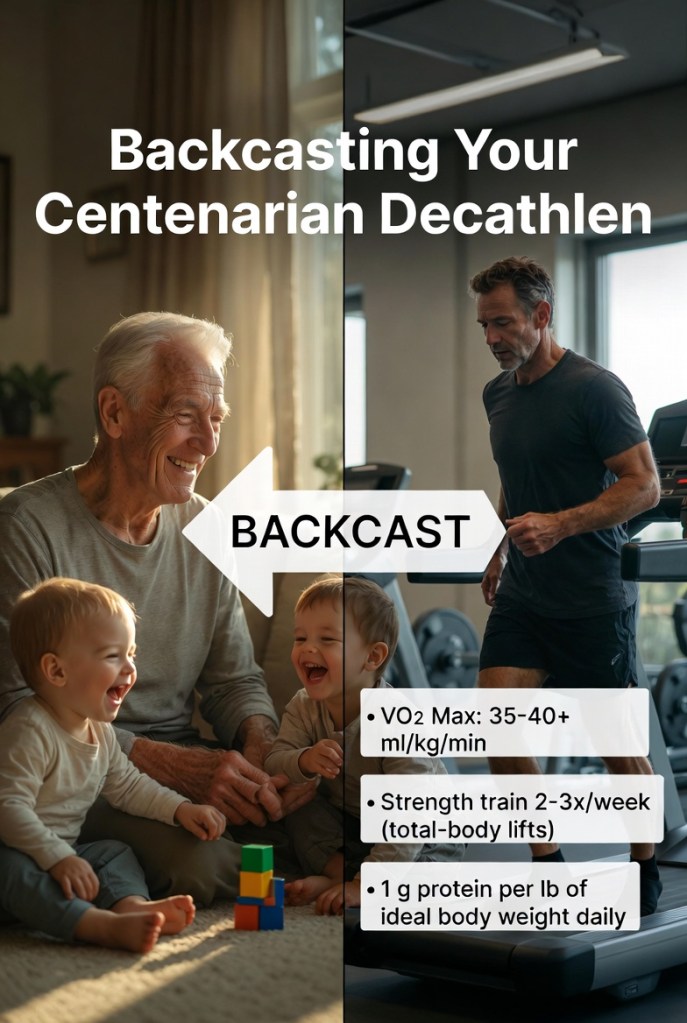 That comment stopped me cold because it connects directly to something I first learned from Peter Attia, MD: the Centenarian Decathlon and the idea of backcasting from your future self to today. It’s one of the most powerful frameworks I know for turning vague hopes into clear, daily marching orders.