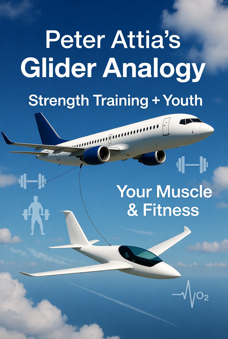 You can slow, minimize, or even partially offset that loss with consistent strength training and protein. Think of it like Peter Attia’s glider analogy: the higher you climb with strength training while the “powered plane” (youth and hormones) is still pulling you, the longer and gentler your glide will be when the plane eventually lets go.