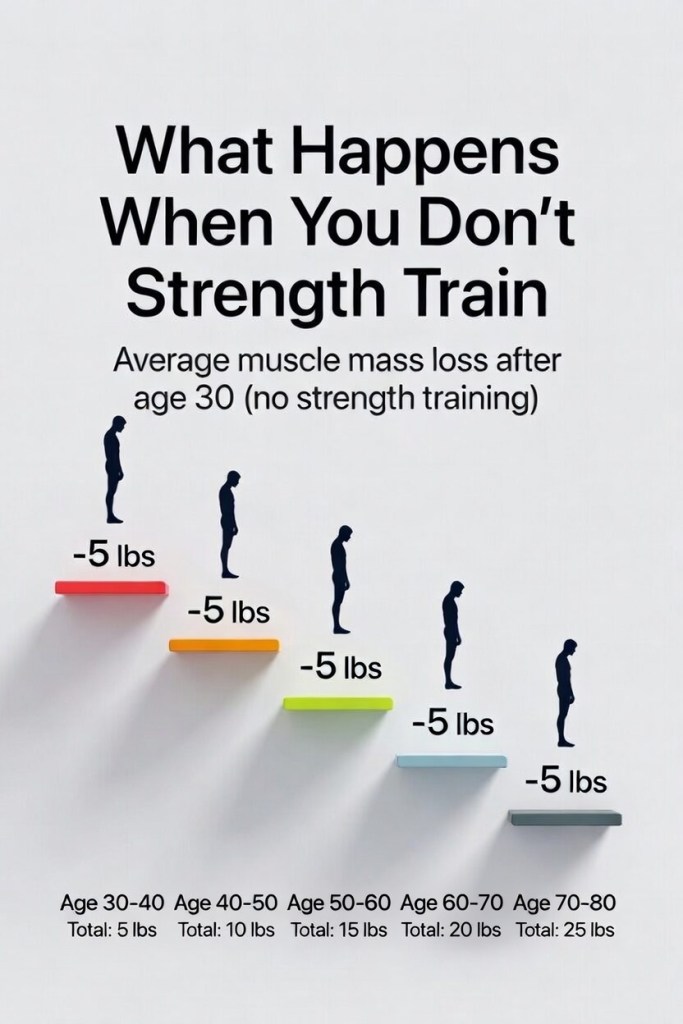 Here’s the reality most people never hear: if you’re not strength training, you lose roughly five pounds of muscle every decade after age 30. From 30 to 80, that’s 25 pounds of muscle gone. Your body literally shrinks. Your engines for movement, balance, and independence disappear.